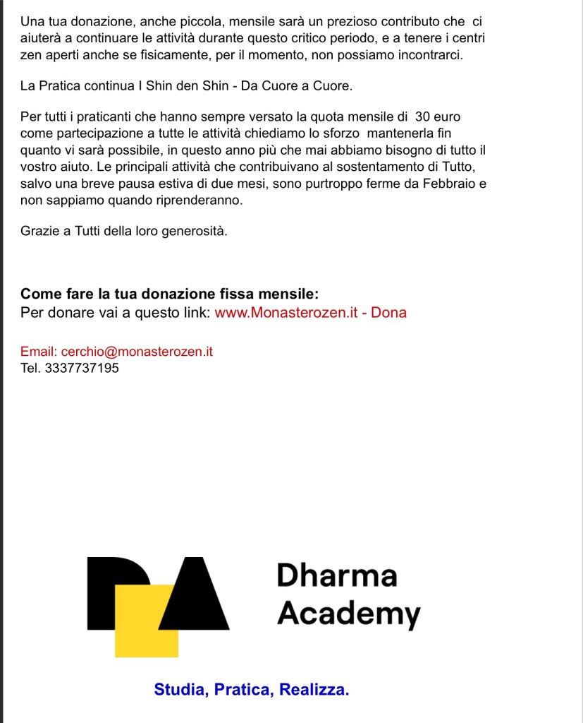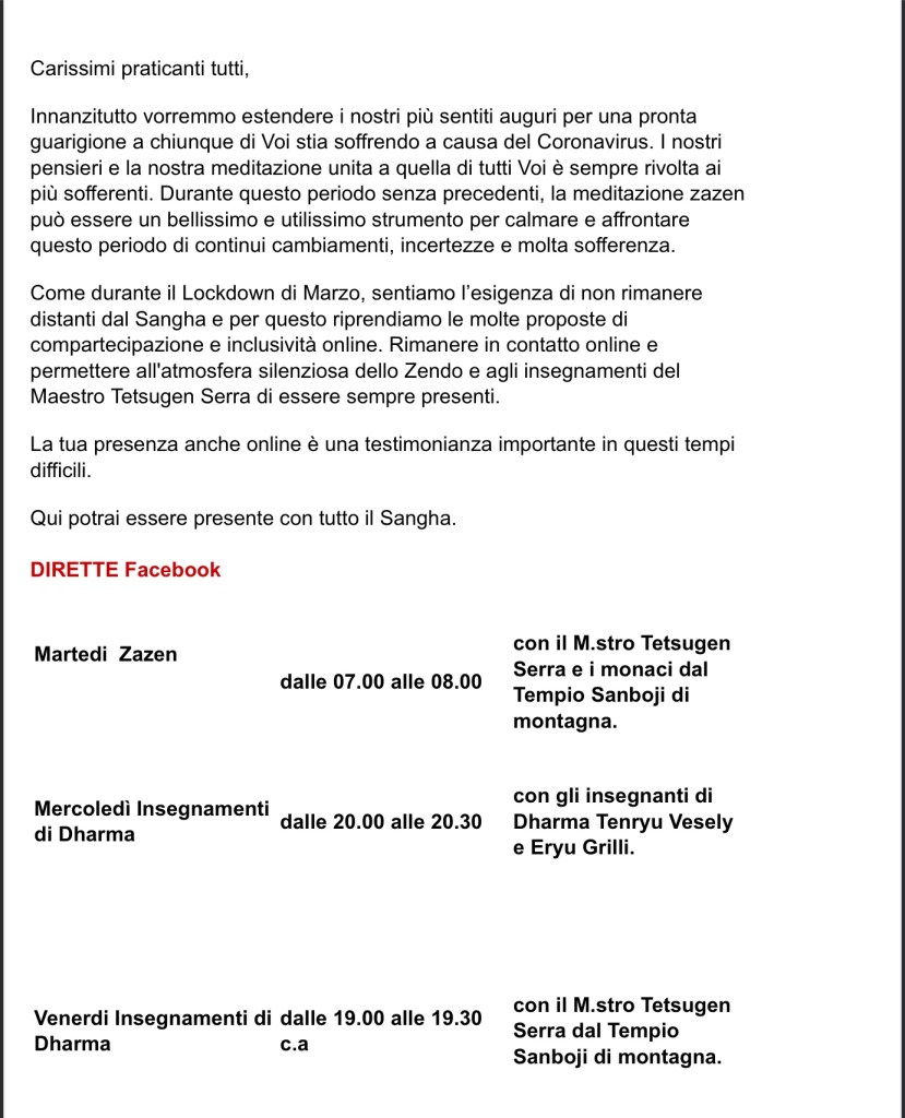 7 – Informeremo per tempo, in questa pagina, sulla ripresa dello zazen al centro, il lunedì sera. Per ora rimane confermato il ritiro di pratica all’eremo della Lovera alla fine di marzo.
