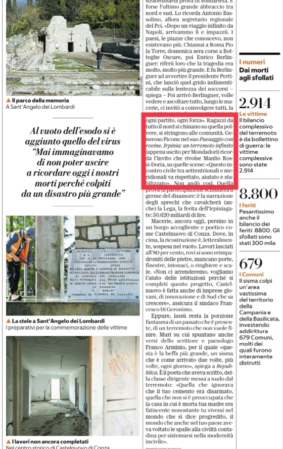 (da Conchita Sannino, “I quarant’anni di solitudine dell’Irpinia ferita”, la Repubblica, 22 novembre 2020, pag. 25)